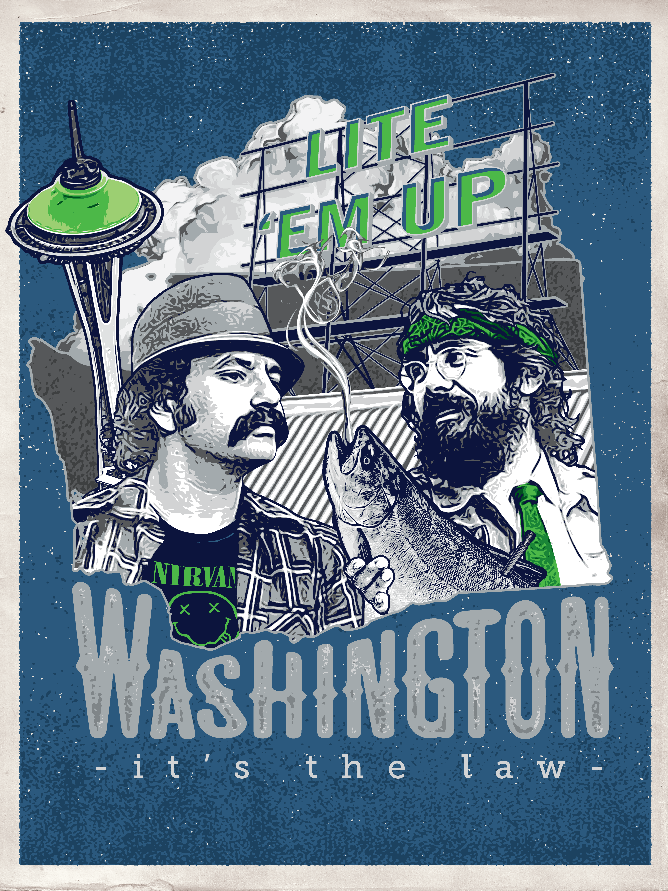 Last, but not least, Lite ‘Em Up Washington! (Again, check the first post for details on this set of posters). This was not on the commission list. In the late summer of 2015, I moved from the Twin Cities to the Seattle area, and in light of the move, I decided to do a version of the Cheech and Chong poster for the great state of Washington. It’s particularly appropriate since Washington is one of the few states where the recreational use of marijuana is actaully LEGAL. Not that I partake–it’s just not for me–but I will absolutely defend anyone’s right to do so. I’ve said it before; toke ’em if you got ’em.