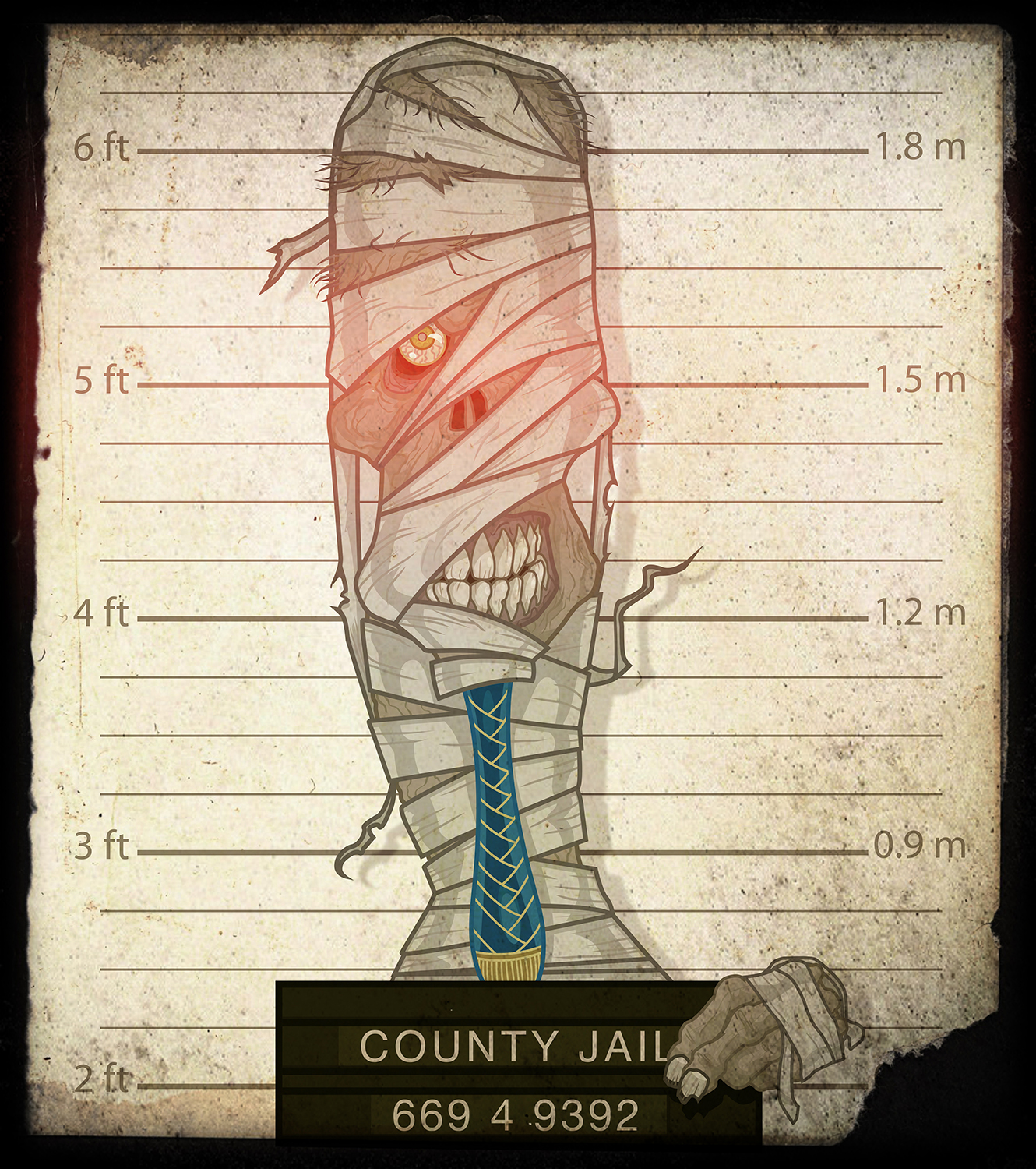 My illustration deviates from the Hollywood image with the addition of the decorated chin piece. mummy-vintage-mugshotThat particular adornment was typically found on the sarcophagus rather than the mummy itself, but I liked the touch of color it added to my graphic. I may have been inspired by a Scooby-Doo cartoon. Who knows. Artistic license, and what not. Plus, Karloff’s masterful makeup retained his features, whereas mine leans more toward the modern zombie-style. Because, zombies. (As always, a vector of this image can be downloaded from iStockPhoto.com. Just 3 credits, kids! Trick-or-Treat! Yay!)